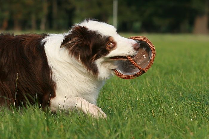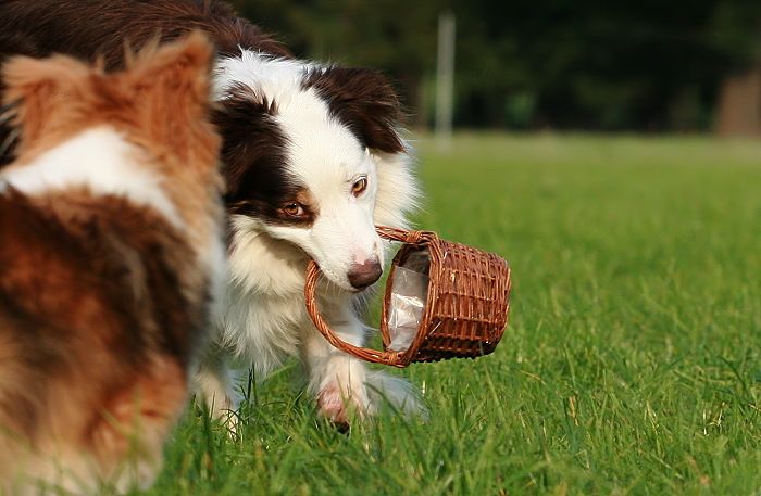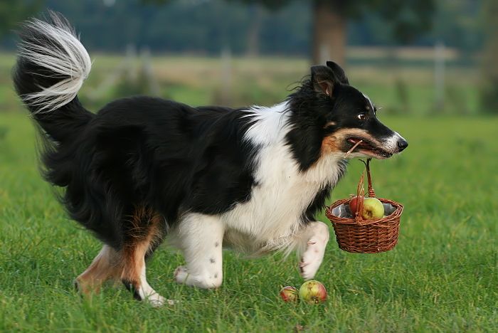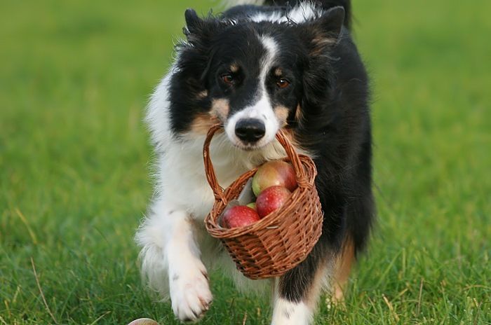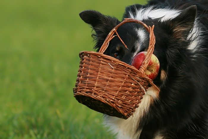 Die Hunde bringen ein Körbchen mit Äpfeln.