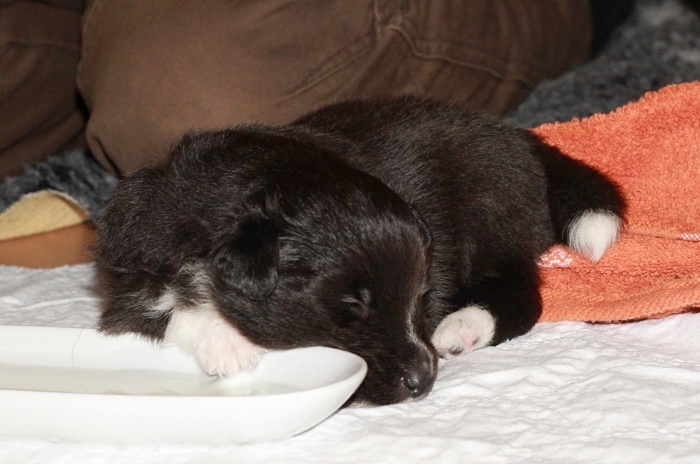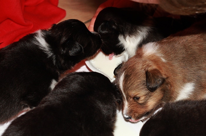 erste Mahlzeit aus der Schale bekam das Quintett mit 3 Wochen.