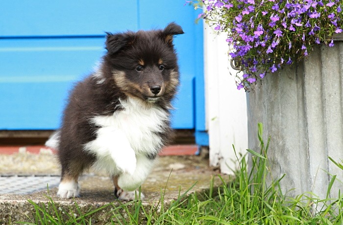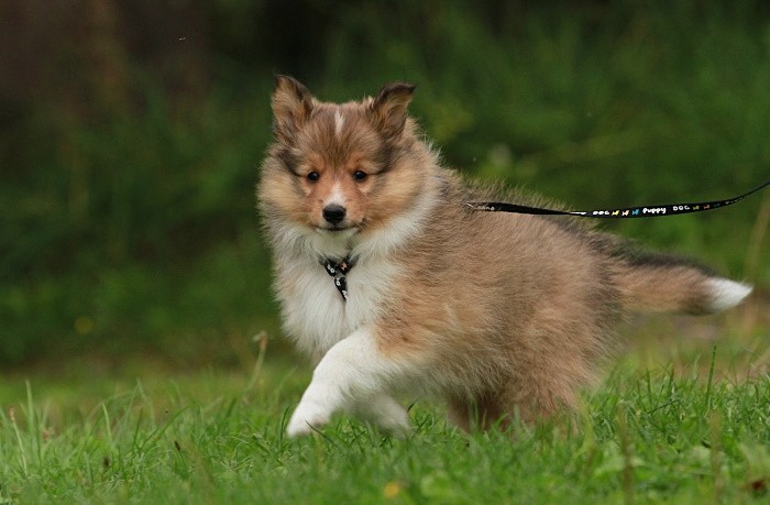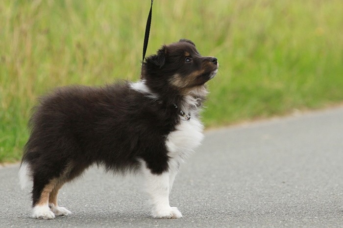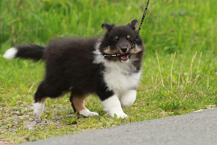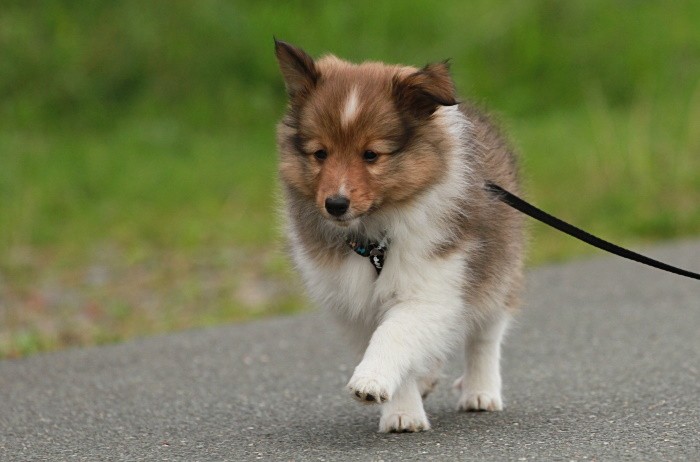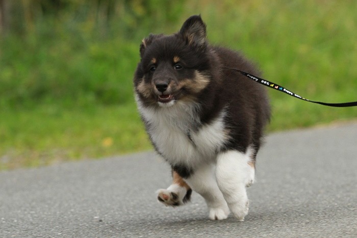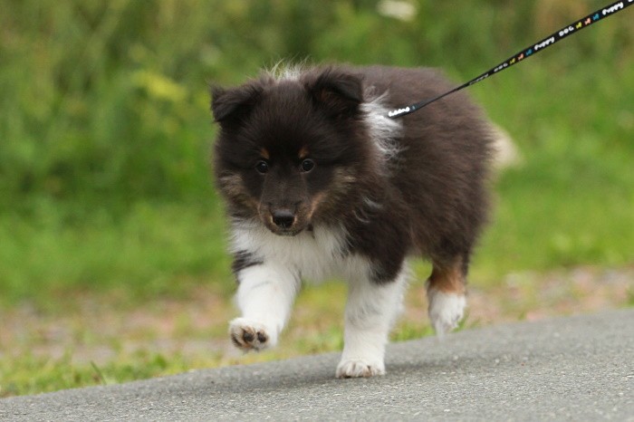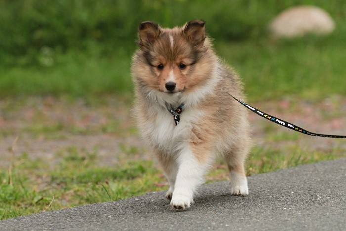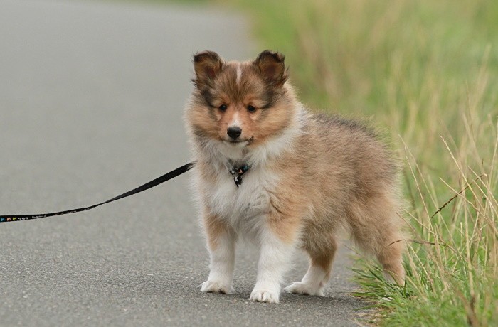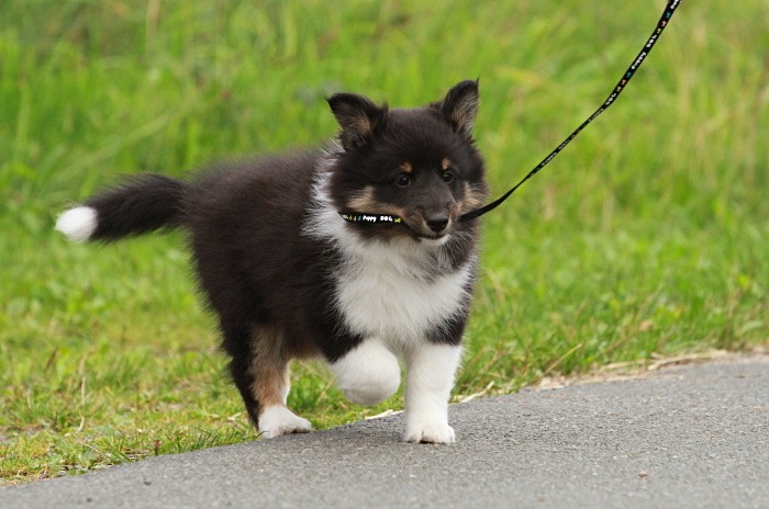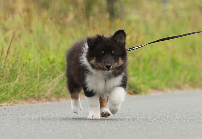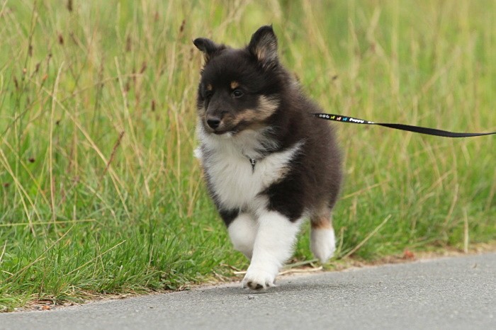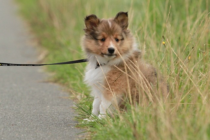 musste sich beim ersten Laufen an der Leine auf dem Weg vorm Haus