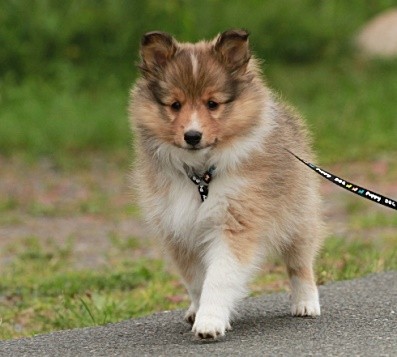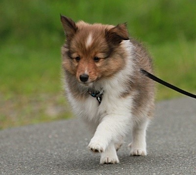und an Halsband und Geschirr und haben ihr erstes Leinelauf-Training