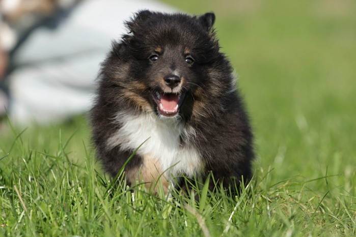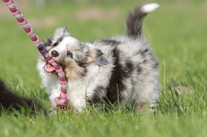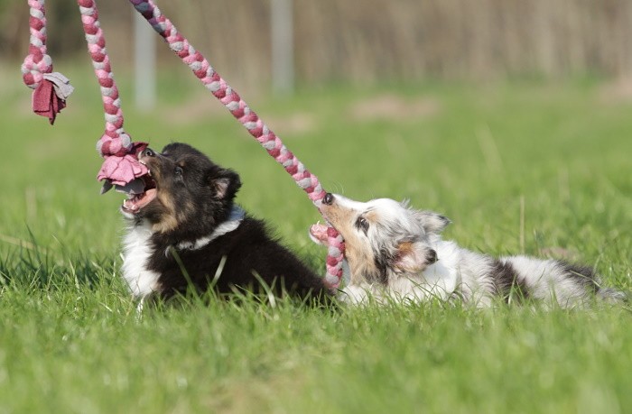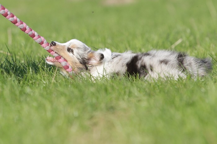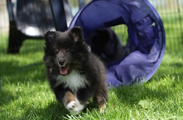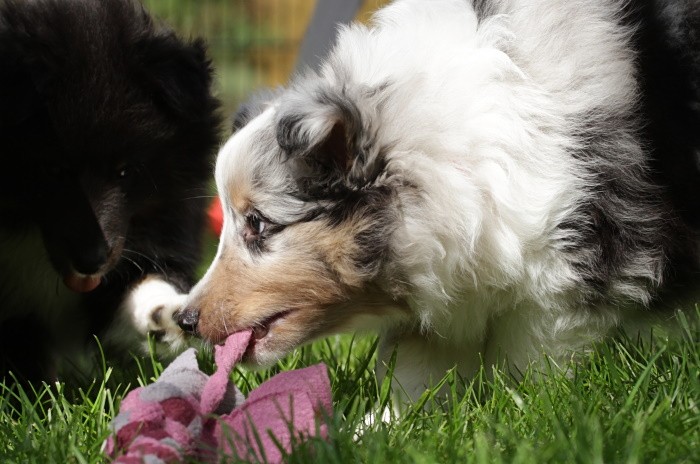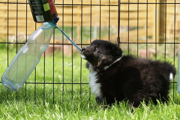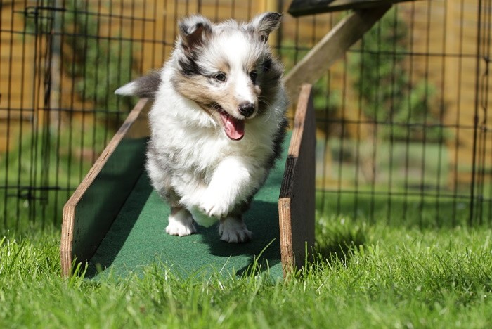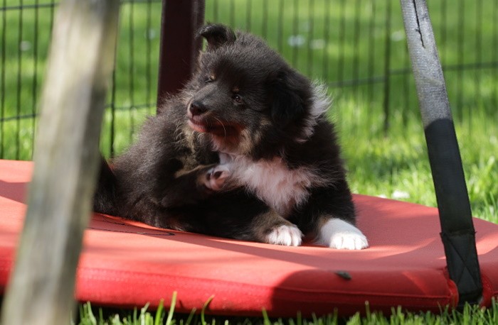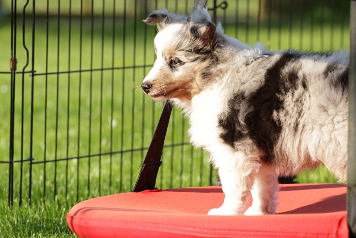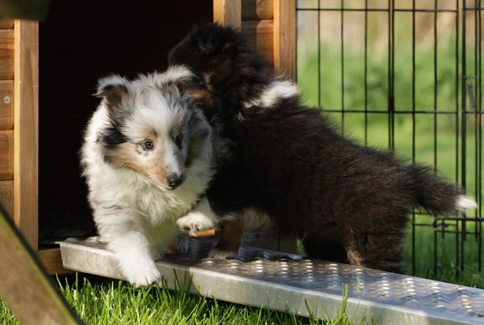 hat auf der neuen Wippe im Welpenspielplatz genauso viel Spaß