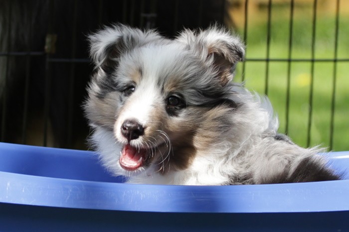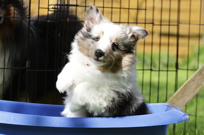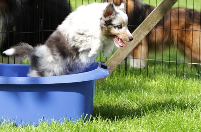 findet es toll immer wieder in die blaue Plastikwanne zu springen