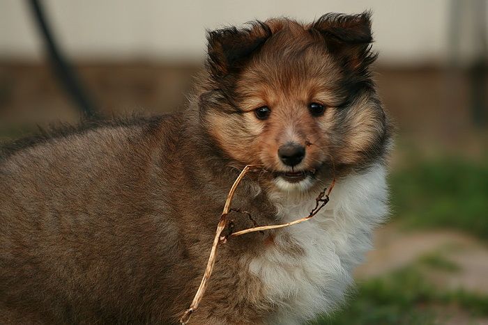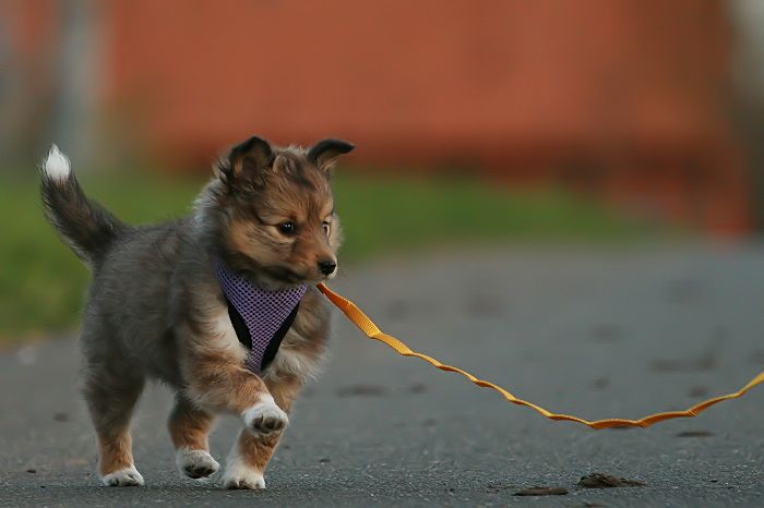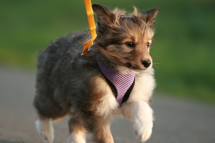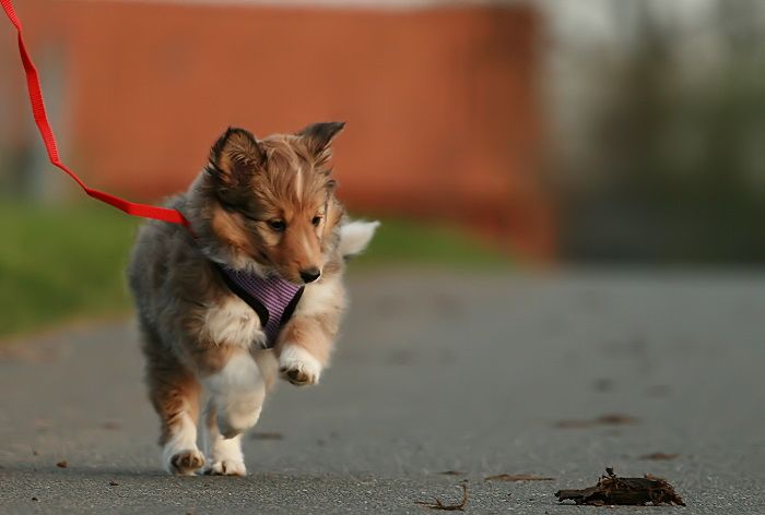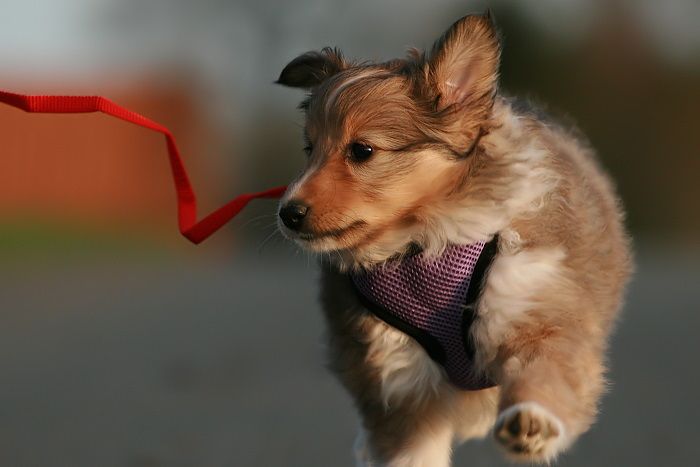 dass Welpe im Geschirr an der Leine nur rückwärts gehen