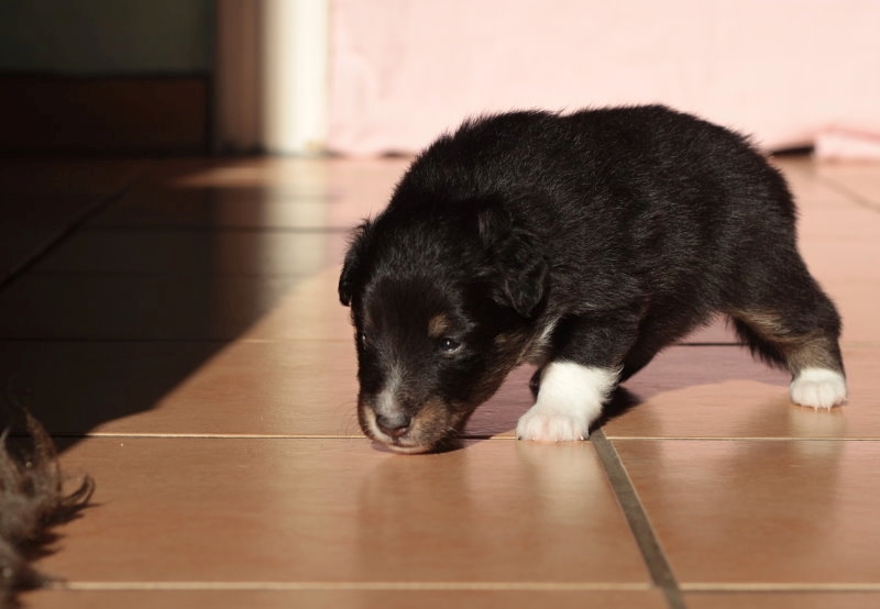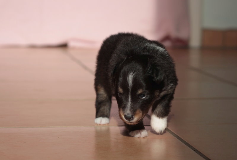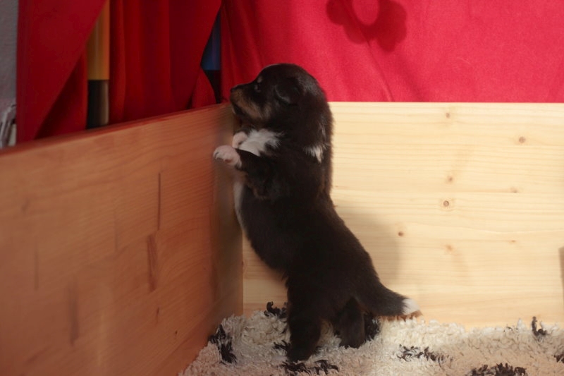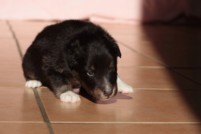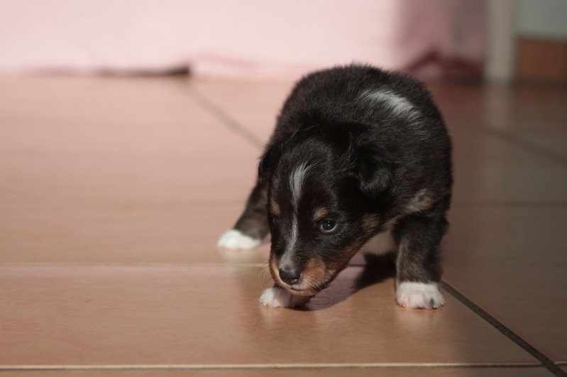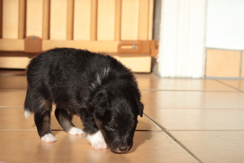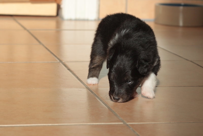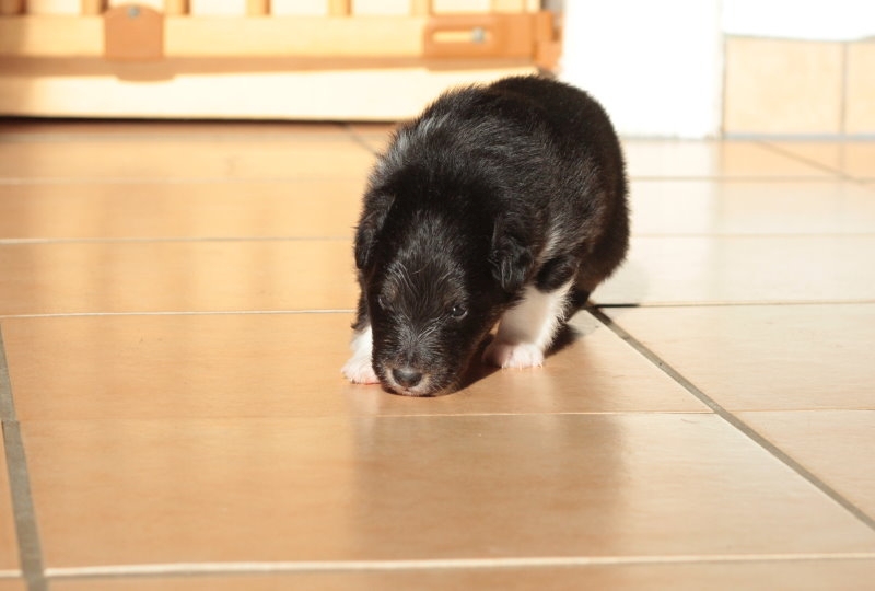 Nuka beim ersten Ausflug im Welpenzimmer auf den glatten Fliesen