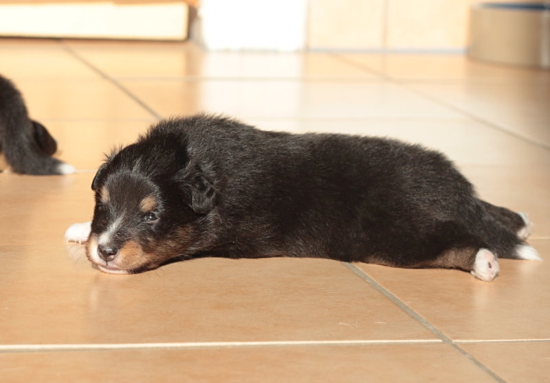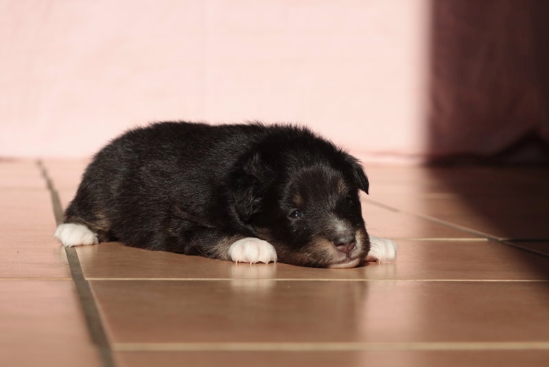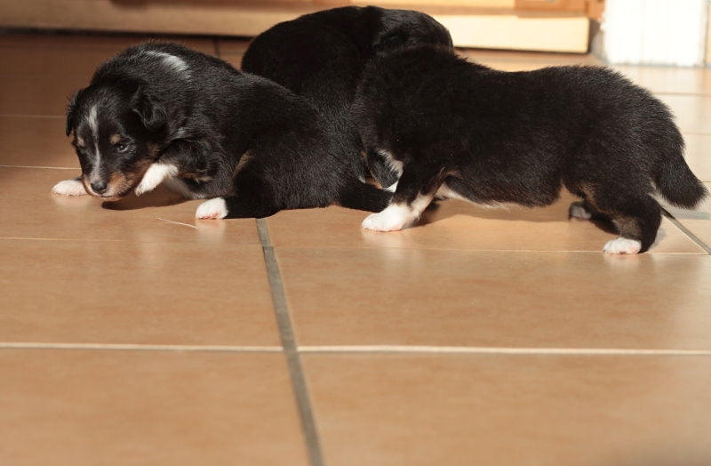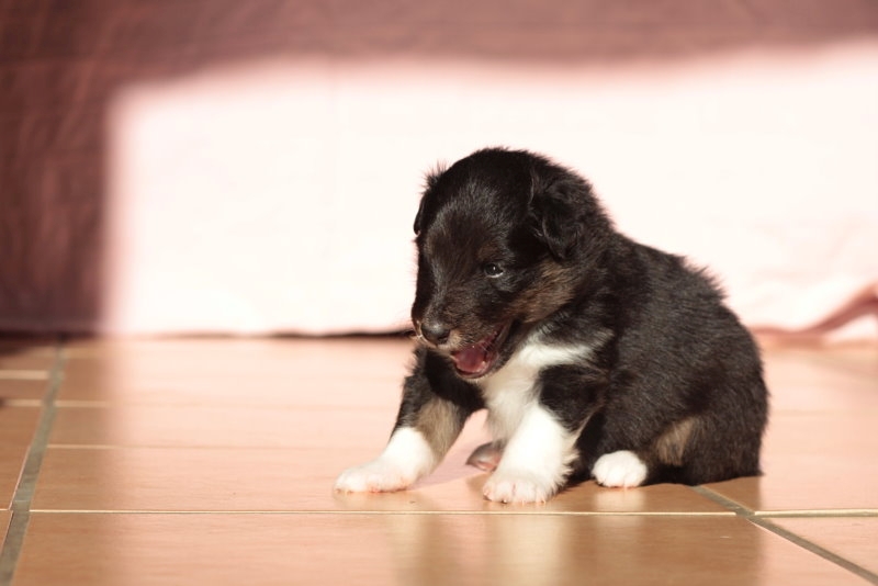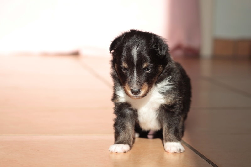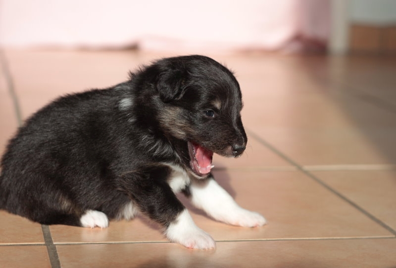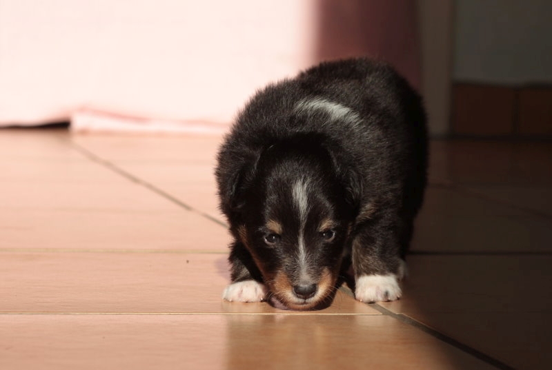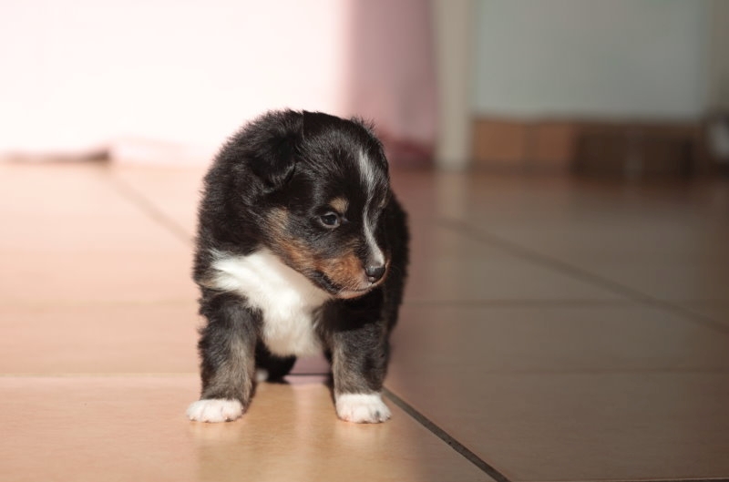 Nuka beim ersten Ausflug im Welpenzimmer auf den glatten Fliesen