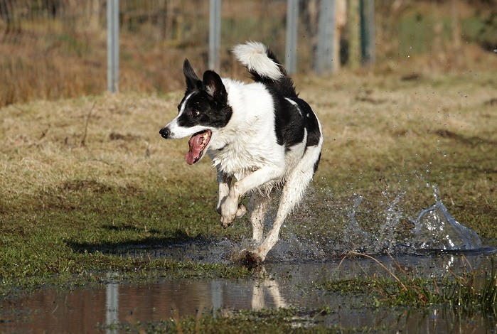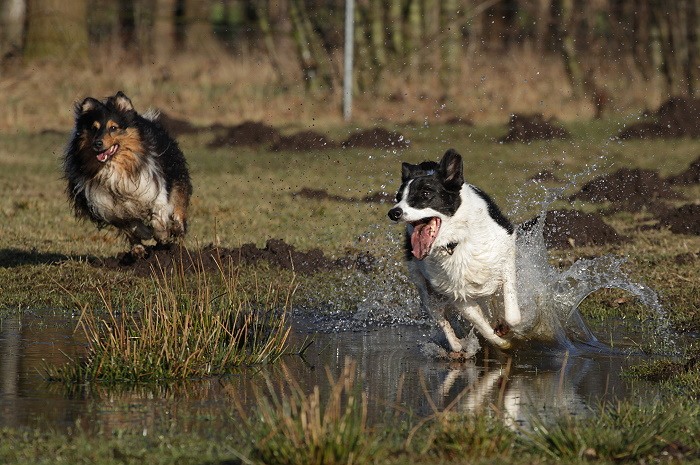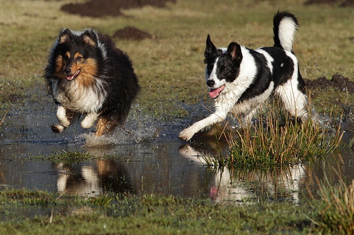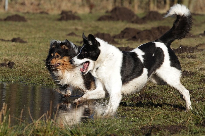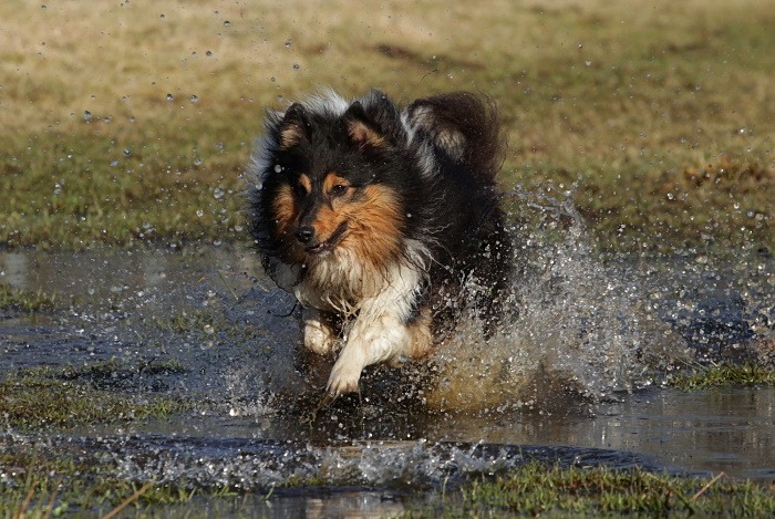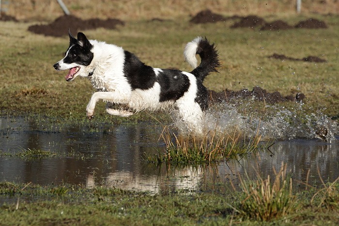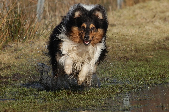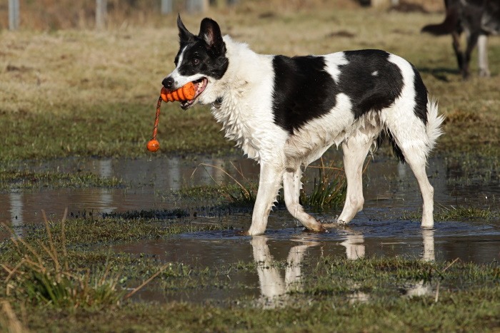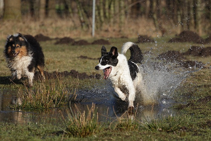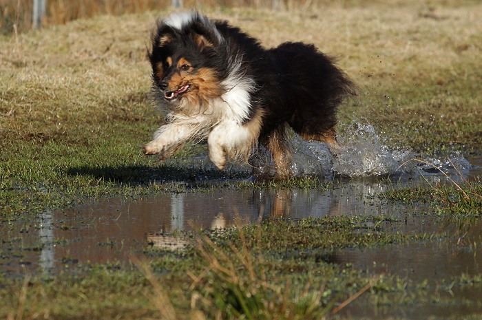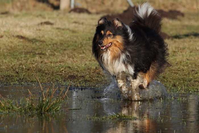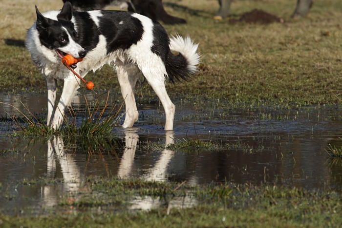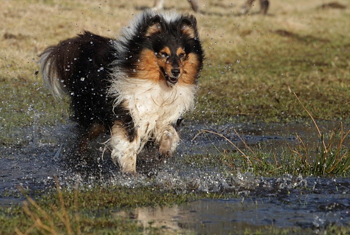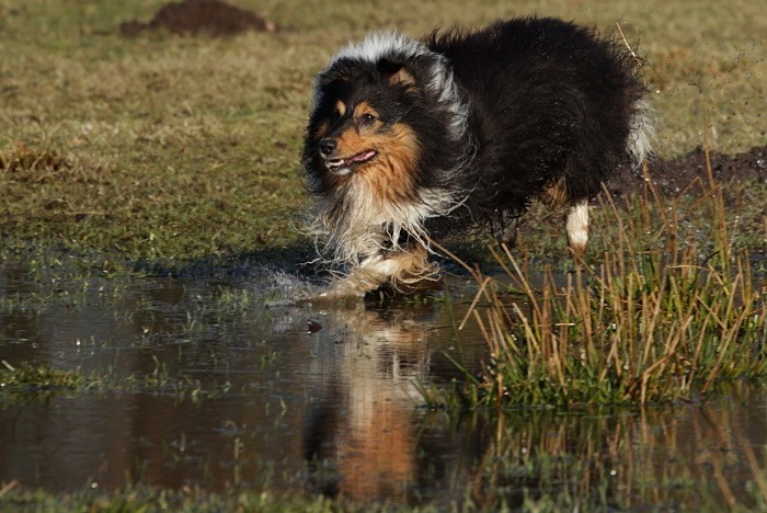 Immer, wenn es besonders viel geregnet hat, entsteht auf einer unserer Weiden ein kleiner Teich. Sealagh und Mitja lieben ihn.