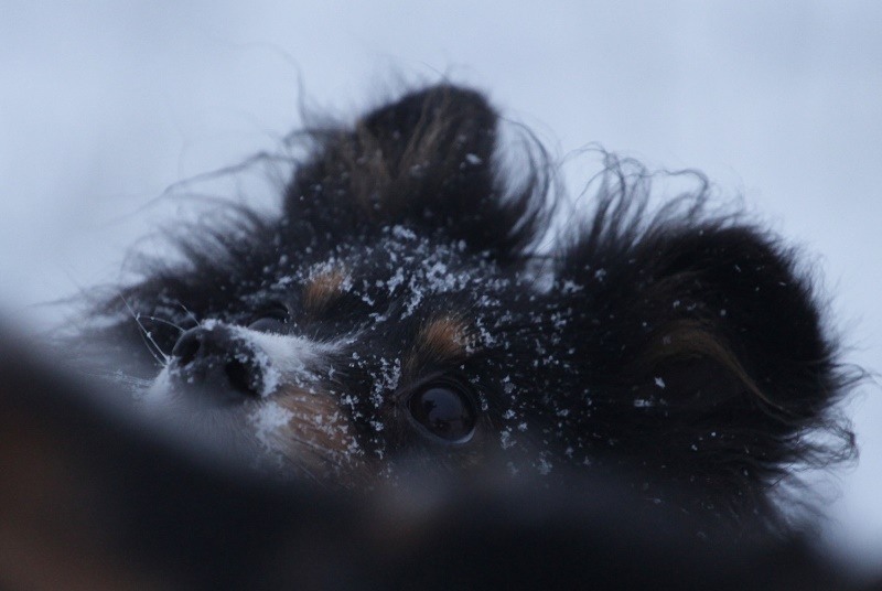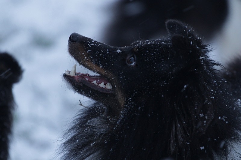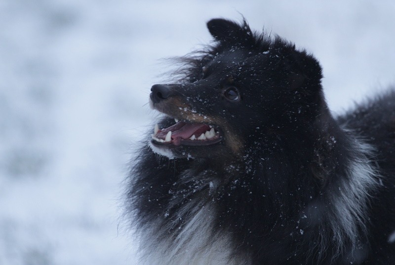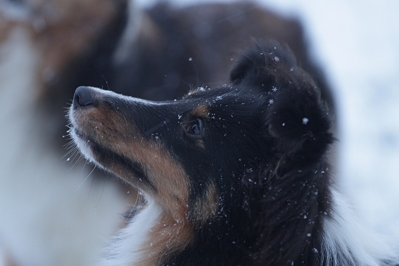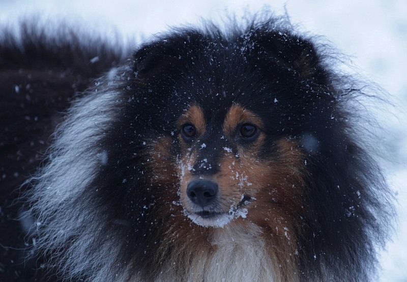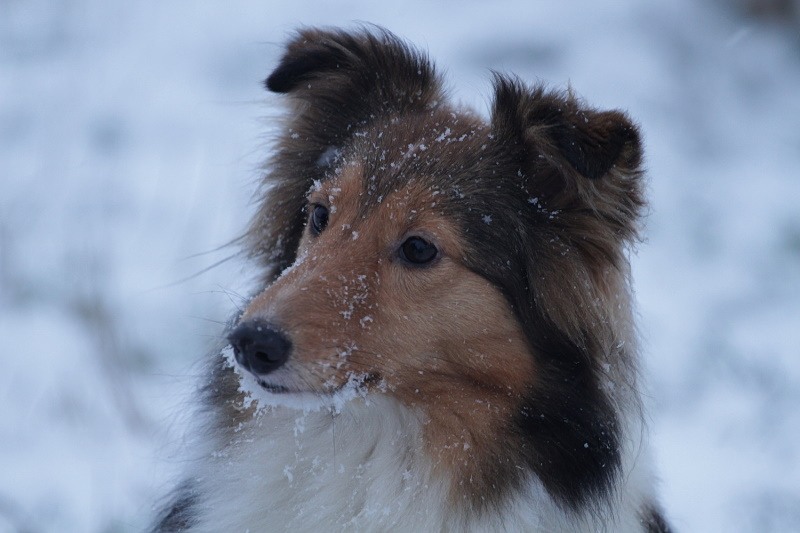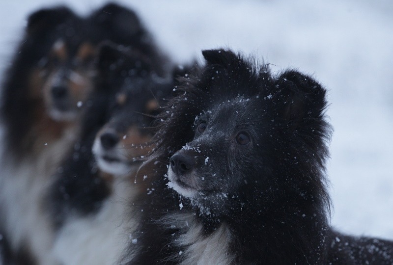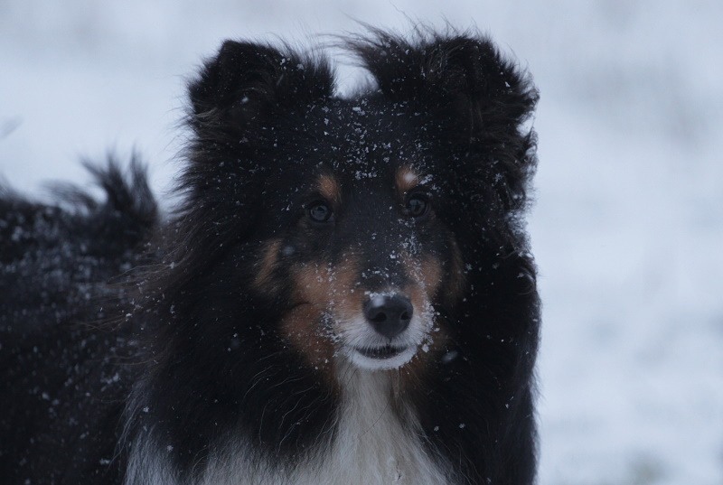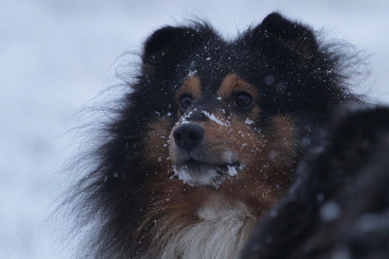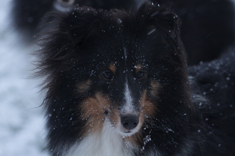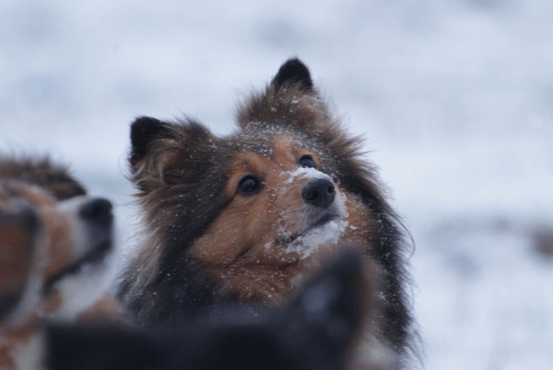 Endlich mal wieder Schnee auf dem Schafhügel, leider ohne Sonne und mit eisigem Wind. Dafür hat das Wetter Schneeflocken wie gemalt auf die Sheltieköpfchen gezaubert: